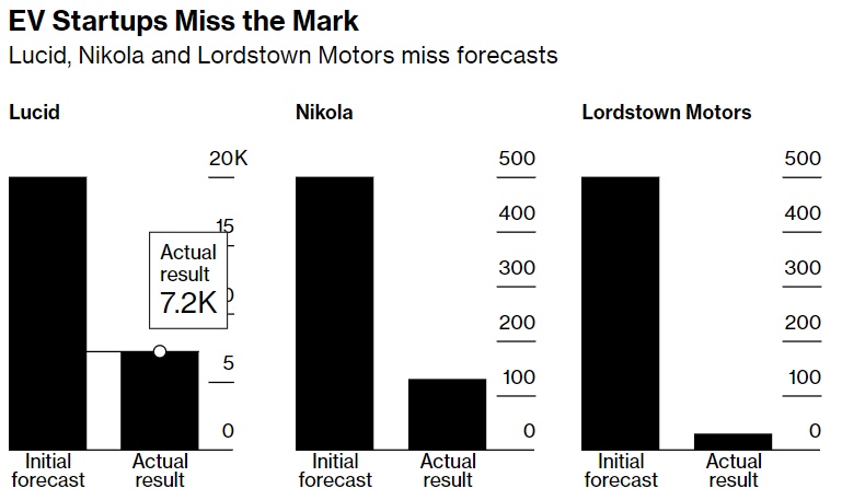 2023年的前景也不乐观。在Lucid预测今年最多只能生产1.4万辆汽车后,该公司股价暴跌。而Nikola表示,预计只交付多达375辆卡车,该公司股价也应声下跌。Lordstown Motors宣布,由于性能和质量问题,自1月份以来已暂停生产和向客户交付产品,此后该公司股价暴跌。