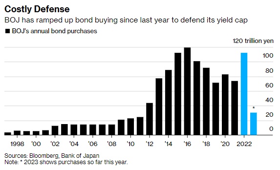 与日本央行的宽松货币立场形成鲜明对比的是,随着央行提高利率以应对通胀,全球债券收益率已经上升。这让日本央行竭力捍卫其 10 年期政府债务 0.5% 的上限,这是其刺激经济和价格的关键措施之一。