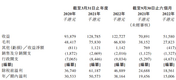 尽管在大本营香港已具备较高影响力,但就业绩规模来看,郝氏控股仍然稍显“迷你”。招股书显示,最近三个财政年度里(2020-2022年截至3月31日止年度),郝氏控股的收入分别为9387.9万港元、1.29亿港元、1.23亿港元,同期该公司的净利润分别为3053.3万港元、5057.3万港元、3816.4万港元,规模均较小,且呈现出一定的波动性。