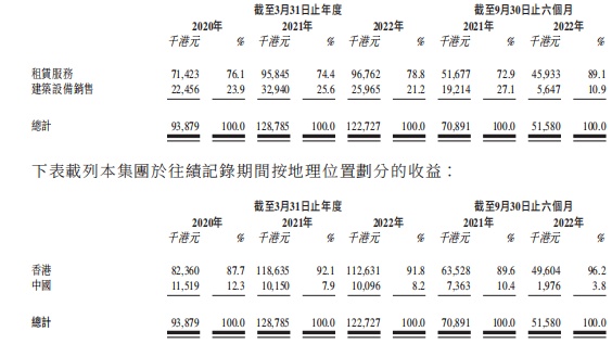 拆分收入结构来看,郝氏控股的收入来源于租赁服务和建筑设备销售两大板块。其中,租赁服务显然是公司的基本盘。以最近三个财政年度及截至2022年9月底止六个月(以下简称“报告期”)的业绩来看,租赁服务的收入分别为7142.3万港元、9584.5万港元、9676.2万港元、4593.3万港元,对应收入占比分别为76.1%、74.4%、78.8%、89.1%。