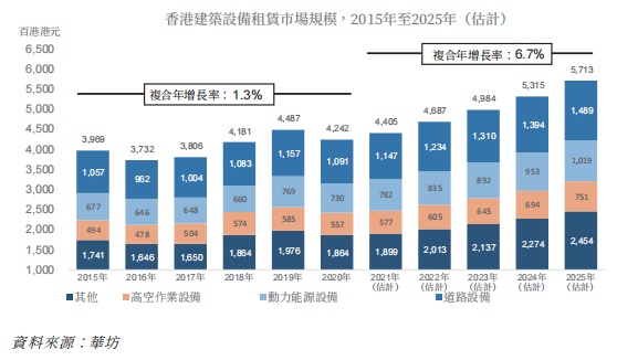 具体到细分行业,根据招股书,2020年香港建筑设备租赁行业的市场规模约为42.42亿港元,2015-2020年的复合年增长率仅为1.3%。而根据机构预测,至2025年,该市场的潜在规模有望升至57.13亿港元,期间复合年增长率有望达到6.7%。