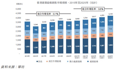 反观香港建筑设备销售行业,数据显示,2020年该行业的市场规模约为36.08亿港元,2015-2020年期间的复合年增长率仅为0.1%,市场近乎停滞。但接下来几年,该市场有望于2025年扩容至42.38亿港元,对应复合年增长率有望提升到3.5%。