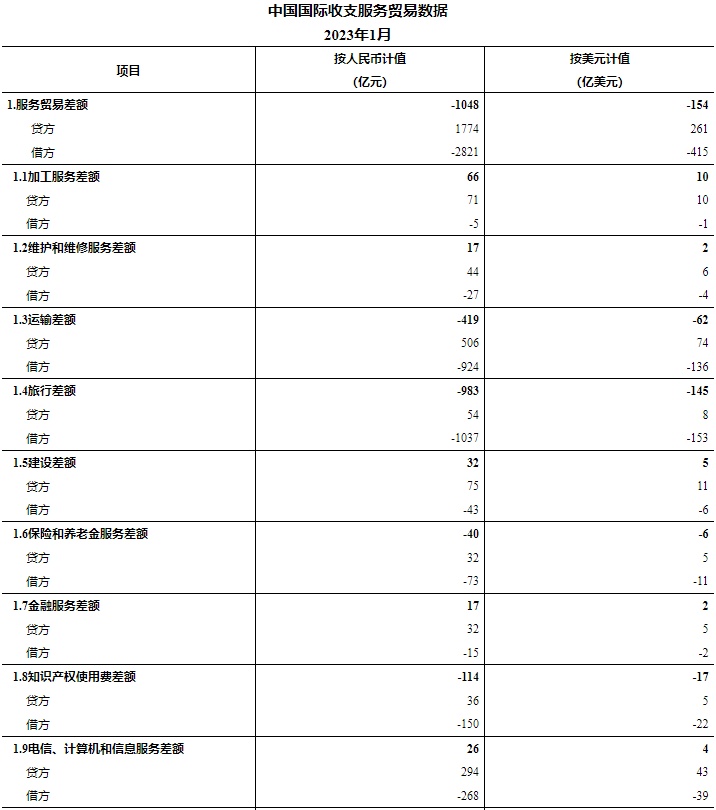 智通财经APP获悉,2月24日,国家外汇管理局公布2023年1月我国国际收支服务贸易数据。2023年1月,我国国际收支服务贸易进出口规模4595亿元。其中,出口1774亿元,进口2821亿元,逆差1048亿元。服务贸易主要项目为:运输服务进出口规模1430亿元,旅行服务进出口规模1091亿元,其他商业服务进出口规模871亿元,电信、计算机和信息服务进出口规模563亿元。按美元计值,2023年1月,我国国际收支服务贸易出口261亿美元,进口415亿美元,逆差154亿美元。