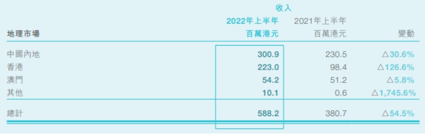 从收入地区结构看,满贯集团的收入来源主要有中国内地、中国香港、中国澳门及其他地区。数据显示,2022上半年,来自中国内地、香港、澳门以及其它地区的收入分别为3亿港元、2.23亿港元、0.54亿港元以及0.1亿港元,收入占比分别为51%、38%、9%以及2%。实际上在2019年,内地市场的收入仅为1515万港元。