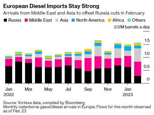 据Vortexa Ltd.初步估计,2月份柴油类燃料的运抵量将略高于1月份的水平,这主要是由于来自中东和亚洲的货物填补了俄罗斯的缺口。