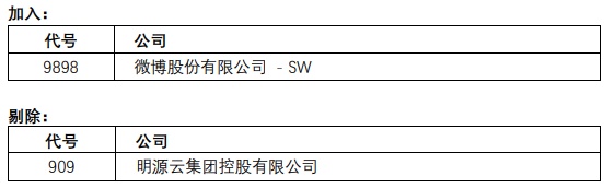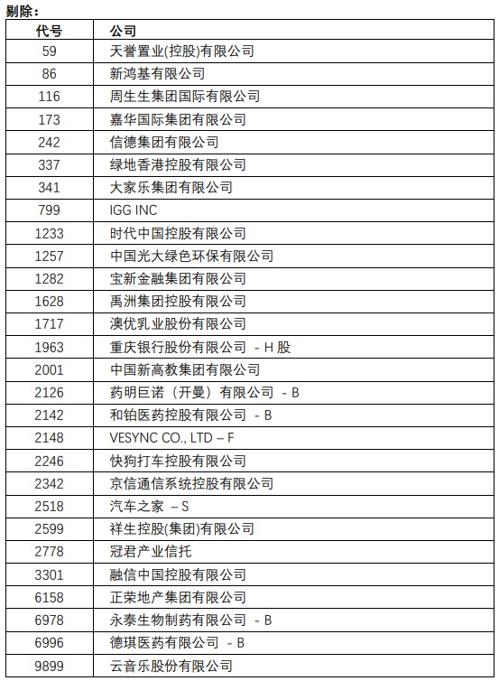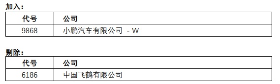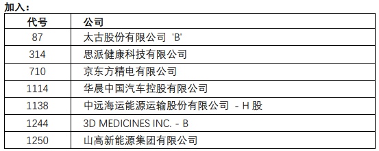 恒生中国企业指数成份股将有以下的变动,成份股数目维持50只。