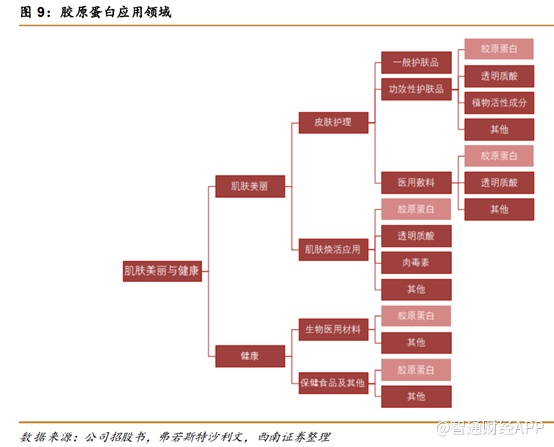 胶原蛋白又可进一步分为重组胶原蛋白和动物源性胶原蛋白。动物源性胶原蛋白为直接从动物组织中提取得来,生产成本较低且工艺较为简单;而重组胶原蛋白由基因工程合成,可以放大动物源性胶原蛋白的优势特性并消除负面作用,实现进一步加工的内在优势,因此重组胶原蛋白在专业皮肤护理市场规模十分可观。