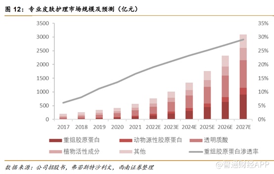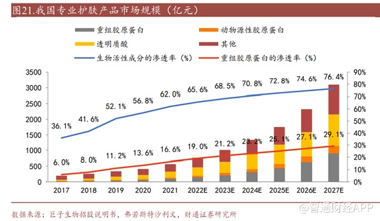 据弗若斯特沙利文统计,2017-2021年中国重组胶原蛋白应用于专业皮肤护理的零售额复合增速为 67.5%,超过动物源性胶原蛋白(32.4%)、透明质酸(44.4%)和植物活性成分(17.6%),是增速最快的专业皮肤护理材料。预计至2027年重组胶原蛋白市场规模将达到901亿元,渗透率达到29.1%。
