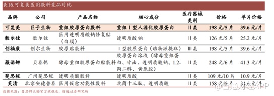 巨子生物的拳头产品主要为可复美以及可丽金。可复美的核心品类为医用敷料,由于胶原蛋白成分的医用敷料价格高于透明质酸成分,因此在竞品中,竞品中的斐思妮的定价要远低于其他公司的产品。可复美价格与创福康近似,区别在于可复美使用重组胶原蛋白技术,而创福康使用的胶原蛋白来自动物源提取,而创福康的认证为Ⅲ类器械,而可复美为Ⅱ类器械。在可比的Ⅱ医用敷料产品中,可复美并不具价格优势。