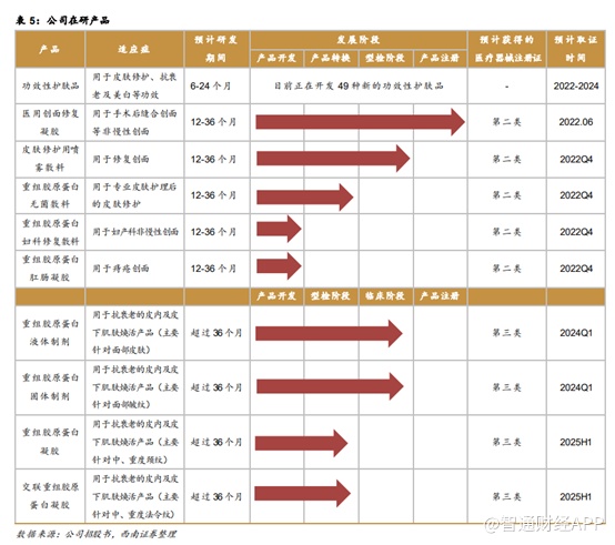 后续在研管线方面,目前公司共有102种在研产品,包括美丽领域产品组合下的 49 种功效性护肤品、37种医用敷料及4种肌肤焕活产品;健康领域产品组合下的2种生物医用产品、7种功能性食品及3种特殊医学用途配方食品。美丽领域产品组合包括4种肌肤焕活产品(重组胶原蛋白液体制剂、重组胶原蛋白固体制剂、重组胶原蛋白凝胶及交联重组胶原蛋白凝胶)及健康领域产品组合下的 2 种生物医用产品(骨修复材料和可吸收生物膜),预计首批作为第三类医疗器械产品的肌肤焕活产品最早将在2023年后获批,骨修复材料和可吸收生物膜预计取证时间分别为2024年和2026 年。