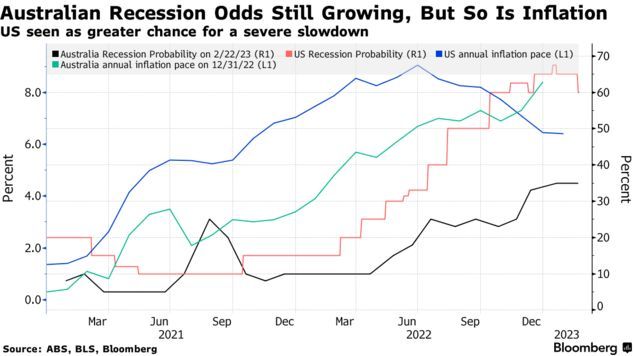 智通财经APP获悉,媒体的的一项调查显示,澳洲联储主席洛威对未来进一步加息的预期促使经济学家和货币市场认为澳大利亚在未来12个月出现经济衰退的可能性上升,超过三分之一,高于去年年底洛威暗示即将暂停加息时的四分之一。相比之下,美国出现衰退的可能性已经开始下降。