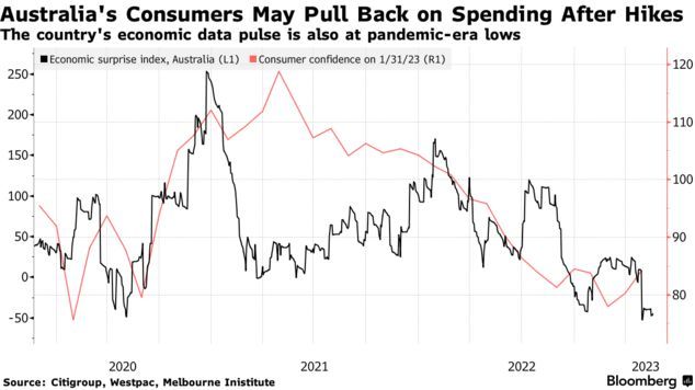 在市场预期澳洲联储将采取更积极行动的同时,澳大利亚的消费者信心指数下滑至接近衰退的水平。尽管美联储将利率上调了4.25个百分点(澳洲联储的上调幅度为3.25个百分点),事实证明美国消费者支出更具韧性。