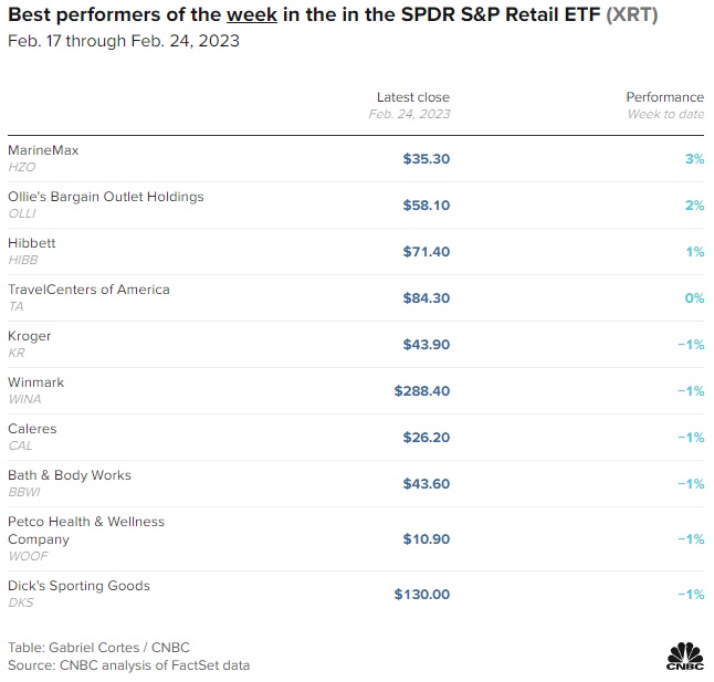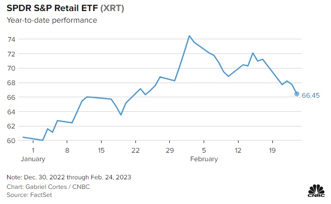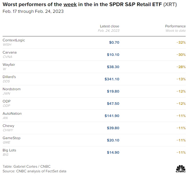 这两家关键消费品公司对2023年的展望周二导致道琼斯指数和标准普尔500指数下跌,市场最近的连续下跌一直持续到周末。对零售类股和消费类股来说,本周也不太好。SPDR S&P Retail ETF今年以来上涨了9%,但上周下跌了约7%,是自2022年7月以来表现最差的一周。非必需消费品类股本周下跌近4.5%,是标准普尔500指数所有板块中表现最差的。