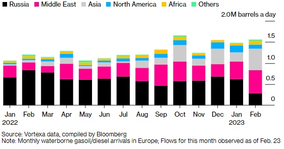 国际能源周(International Energy Week)将于周二在伦敦拉开帷幕,届时资深行业领袖、投资者和政府官员将齐聚一堂,以讨论能源安全和金融、气候变化、中国需求以及俄乌冲突的后果,包括数十年来原油和成品油流向的改道。如图2所示,即使在制裁开始后,欧洲本月柴油进口仍然保持强劲,进口总额将略高于1月份水平,其中主要原因是来自来自中东和亚洲的供应抵消了俄罗斯在2月的减产。
