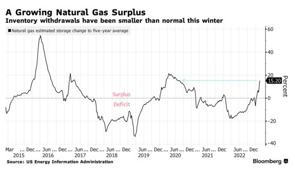 美国当前天然气储量丰富,如图4所示,美国取暖和发电厂燃料的库存与五年平均水平相比,处于2020年8月以来的最高水平,当时消费因疫情相关的封锁受到了抑制。此外,暖冬和气温的季节性转变可能会导致库存进一步攀升,可能达到2016年和2017年以来的最高水平。值得一提的是,由于生产商暗示产量增长放缓,天然气期货价格在上周跌破每百万英热单位2美元后,最近几天有所反弹。