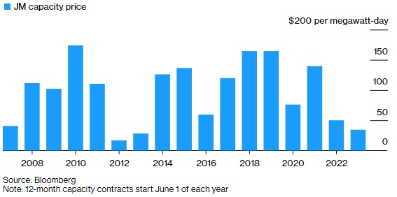 PJM Interconnection LLC运营着美国最大的电网,为从华盛顿特区到伊利诺伊州的6500多万美国人提供电力服务。该公司将在周一下午公布结果时,通过 2024 年 6 月开始的年度产能拍卖了解他们将获得多少收入。由于供应持续过剩,价格在前两次拍卖中暴跌,虽然众所周知难以预测,但许多人预计所谓的产能清算价格将进一步下降。这可能无助于遏制供过于求,因为在电价上涨之际,许多发电企业去年实现了创纪录的利润,从而创造了一条生命线。然而,如果一些老厂关闭或新厂延期完工,产能价格就有大幅上涨的风险。