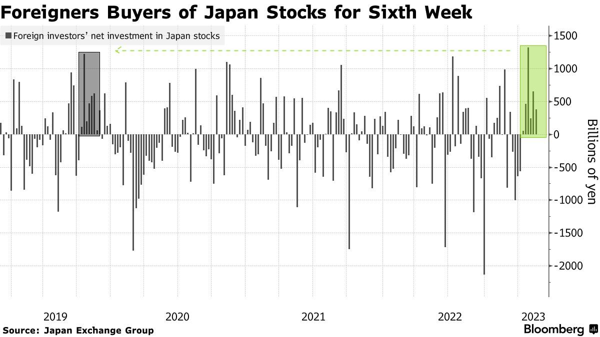 智通财经APP获悉,外国投资者连续六周成为日本股票的净买家,这是自2019年以来持续时间最长的一次。分析人士猜测,可能是外国投资者认为日本短期内将继续实施宽松货币政策,以及外国投资者预期随着日本公司改善治理,估值也会随宽松政策利好而继续扩大。