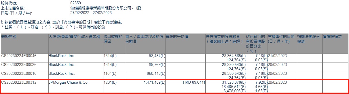 智通财经APP获悉,香港联交所最新资料显示,2月20日,小摩减持药明康德(02359)147.1489万股,每股作价89.6411港元,总金额约为1.32亿港元。减持后最新持股数目约为3132.84万股,最新持股比例为7.92%。