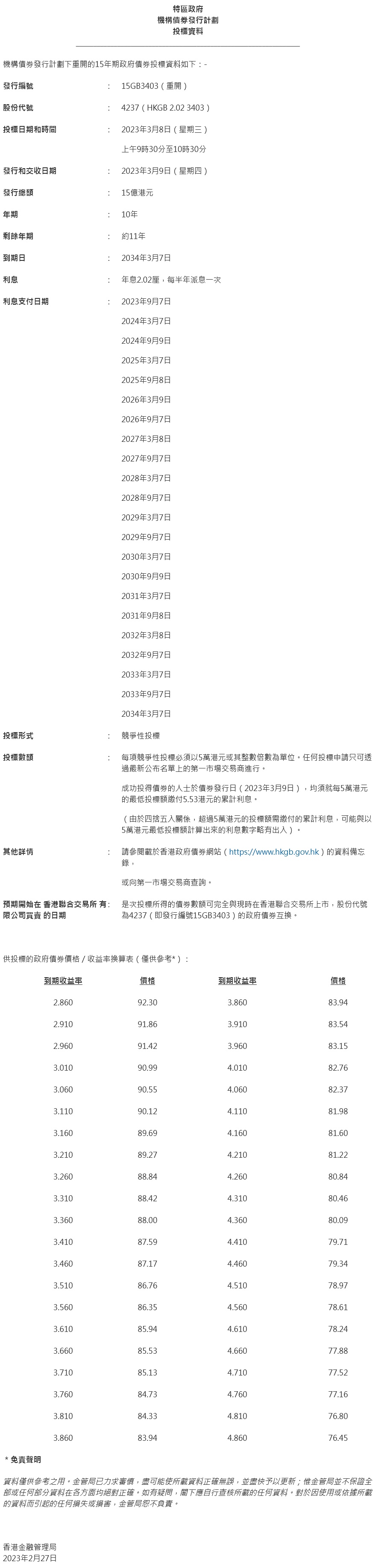 智通财经APP获悉,2月27日,香港金融管理局公布,重开在机构债券发行计划下推出的15年期政府债券(债券),作10年期债券供投标。该批重开债券将于2023年3月8日进行投标,并于2023年3月9日交收。