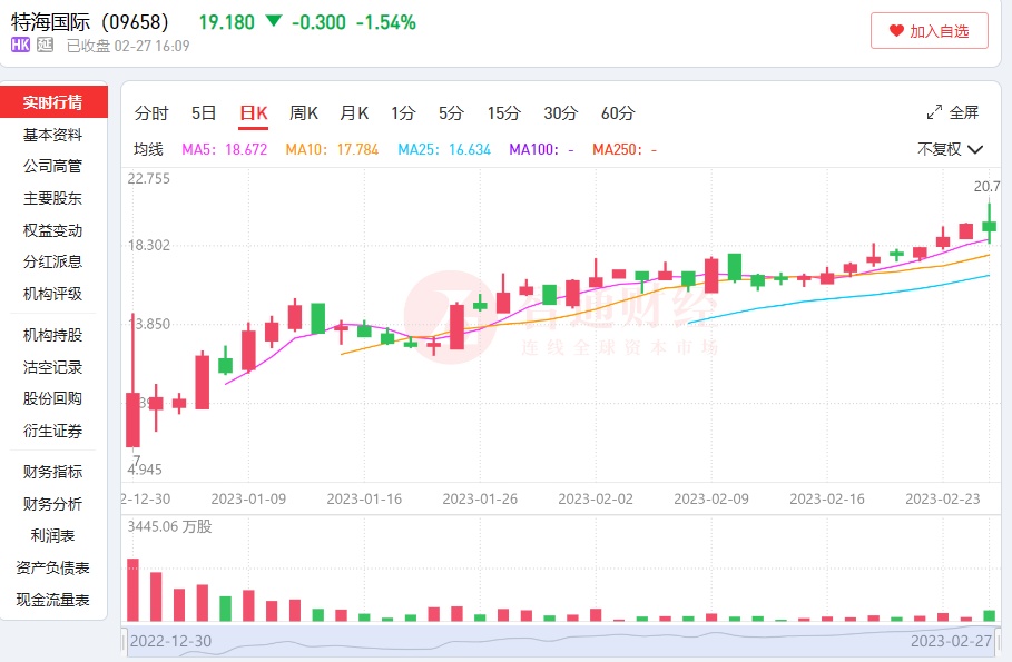 近期,特海国际(09658)的表现亦没有辜负投资者的信心。2月27日盘中,公司触及上市以来新高点20.70港元。截至收盘,公司收报19.18港元,总市值达118.79亿港元。