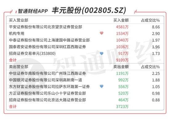 丰元股份(002805.SZ):多主力现身龙虎榜,机构席位买入1466万元,买三是顶级游资章盟主的席位买入1024万元,买五是知名游资的席位买入819万元,当日净买入6057万元,该股今日底部首板,有望冲击半年线。