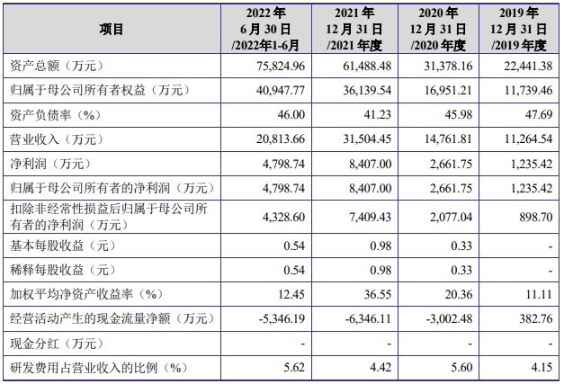 财务方面,于2019年度、2020年度、2021年度以及2022年6月30日,公司实现营业收入分别为1.13亿元、1.48亿元、3.15亿元、2.08亿元。其中,公司实现净利润分别为1235.42万元、2661.75万元、8407万元、4798.74万元。