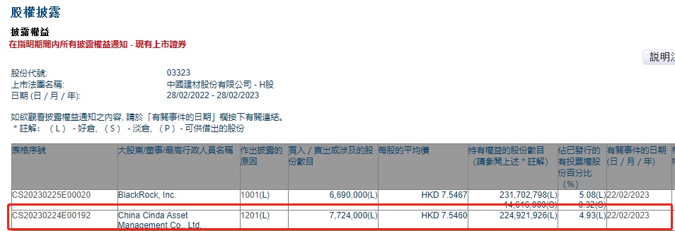 Ltd.减持中国建材(03323)772.4万股,每股作价7.546港元,总金额约为5828.53港元。减持后最新持股数目约为2.25亿股,最新持股比例为4.93%。