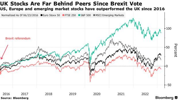 在过去一年,英国国内局势动荡拖累英镑兑美元汇率一度接近平价,英国股市也成为全球最不受欢迎的股票。自2016年英国公投“脱欧”以来,英国富时100指数和富时250指数的表现明显落后于所有主要股指;自2021年底英国正式“脱欧”以来,英国富时250指数下跌了15%。