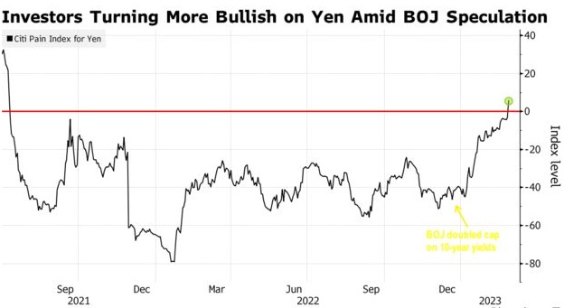 因此,花旗日元痛苦指标(衡量交易员整体头寸的指标)自2021年以来首次攀升至零以上,这是积极情绪升温的迹象。投资者继续押注日本央行行长4月换届将推动更多政策调整,预计这将提振日元。