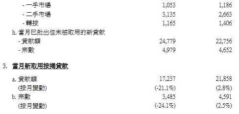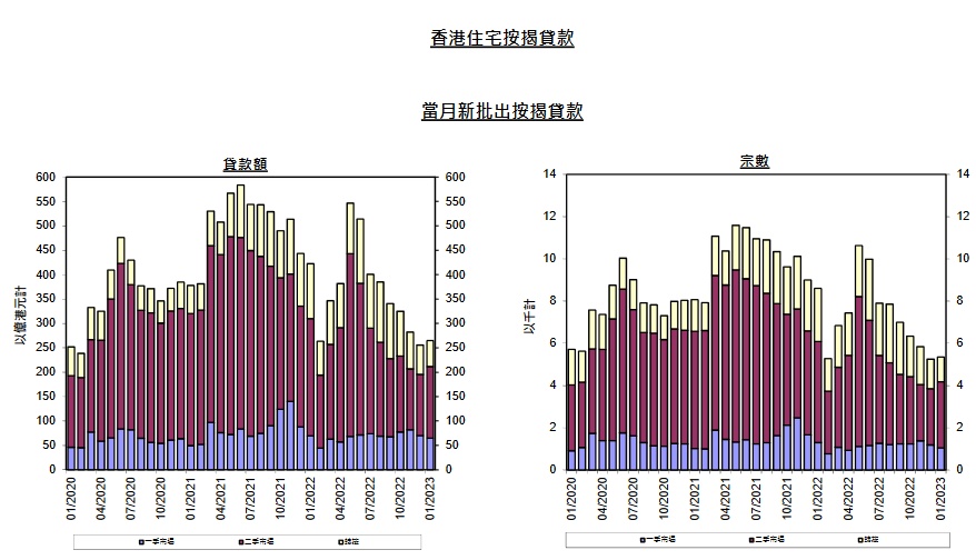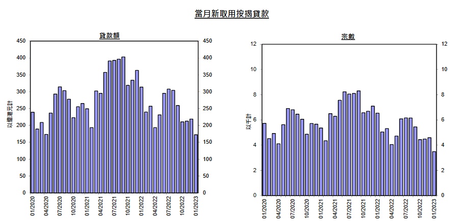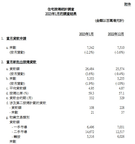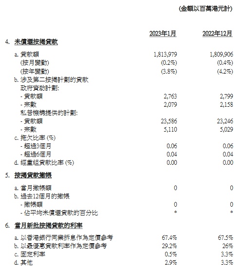 2023年1月份新取用按揭贷款额较2022年12月份减少21.1%,至172亿港元。以香港银行同业拆息作为定价参考的新批按揭贷款所占比例,由2022年12月份的67.5%下降至2023年1月份的67.4%。以最优惠贷款利率作为定价的新批按揭贷款所占比例,由2022年12月份的26%上升至2023年1月份的29.2%。2023年1月底未偿还按揭贷款总额按月增加0.2 %,至18,140亿港元。按揭贷款拖欠比率维持于0.06%,经重组贷款比率维持于接近0%。