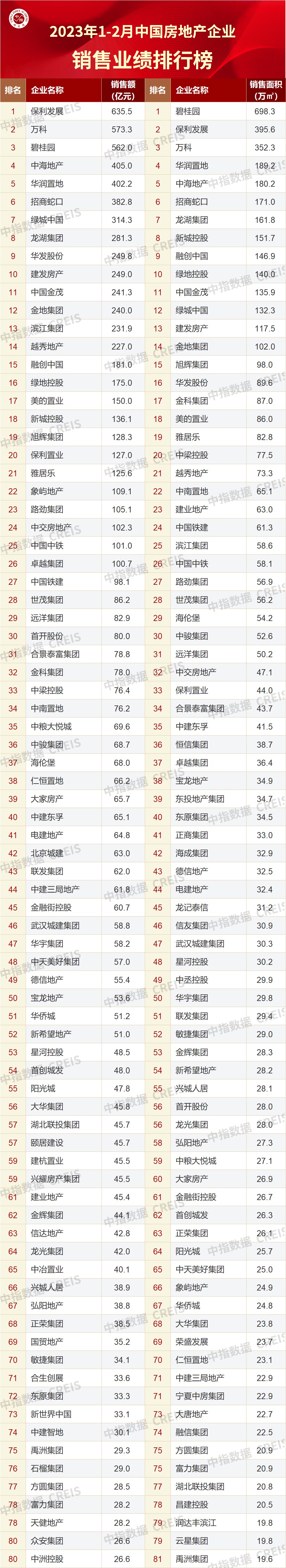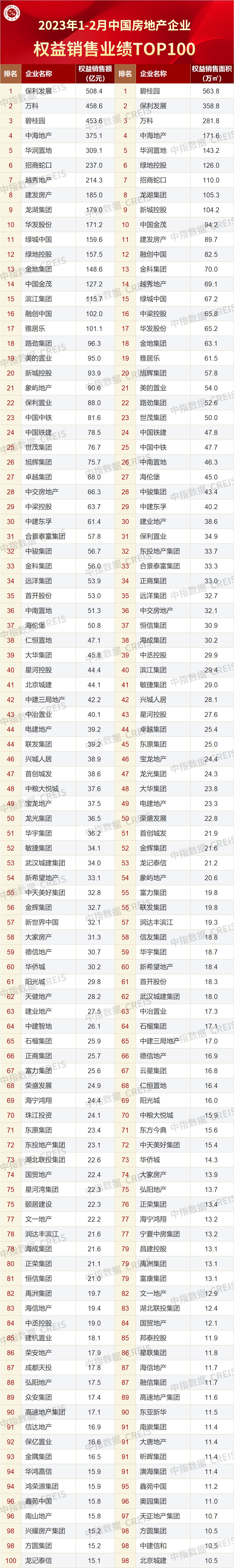 智通财经APP获悉,2月28日,中指研究发布2023年1-2月中国房地产企业销售业绩排行榜。数据显示,2023年1-2月,TOP100房企销总额为9841.1亿元,同比下降4.8%,较去年同期降幅大幅收窄29.2个百分点。其中TOP100房企2月单月销售额环比上升35.1%,同比上升28.5%,实现双增长。1月以来,政策保持较大宽松力度,部分二线城市利好政策继续较大释放,同时,刚需及改善产品入市发力,加之人们购房预期有一定上升,综合致销售额较大提升。销售额超百亿房企26家,较去年同期减少4家;超五十亿房企26家,较去年同期持平。TOP100房企权益销售额为7026.1亿元,权益销售面积为4386.8万平方米,同比分别下降9.5%