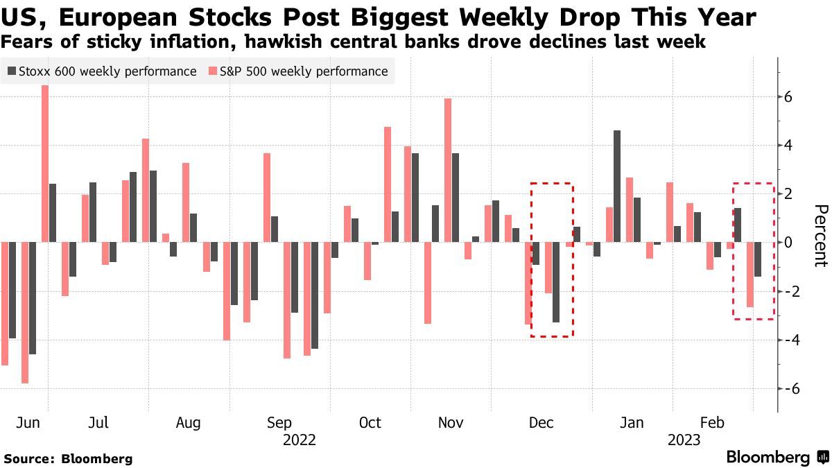 美国和欧洲股市在2023年初大幅上涨后,在上周都创下了今年以来的最大五日跌幅,原因是通胀顽固的迹象加剧了人们对各大央行坚持鹰派立场的担忧。摩根士丹利知名空头Michael Wilson以及其他市场策略师也警告称,由于业绩不佳和估值过高,3月份股市将面临压力;摩根大通策略师周一也表示,股市的风险回报仍然很低。