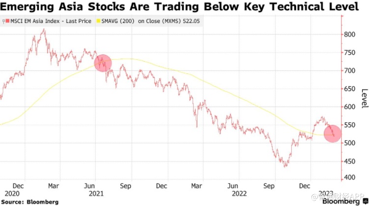 MSCI亚洲新兴市场指数2月份下跌约7%,或将创下去年9月以来最大单月跌幅。该指标已跌破200日移动均线,这可能预示着未来还会出现更多疲软。