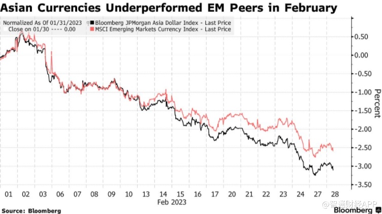 亚洲货币指标2月份下跌近3%,表现逊于新兴市场货币。韩元和泰铢领跌亚洲货币。