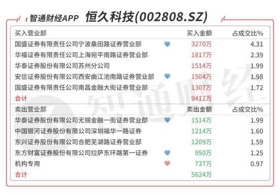 恒久科技(002808.SZ):多主力现身龙虎榜,机构与游资出现分歧,机构席位卖出737万元,买一是知名游资的席位买入3223万元,买四是顶级游资方新侠的席位买入1504万元,当日净买入4675万元,该股今日T字涨停,预计有溢价。