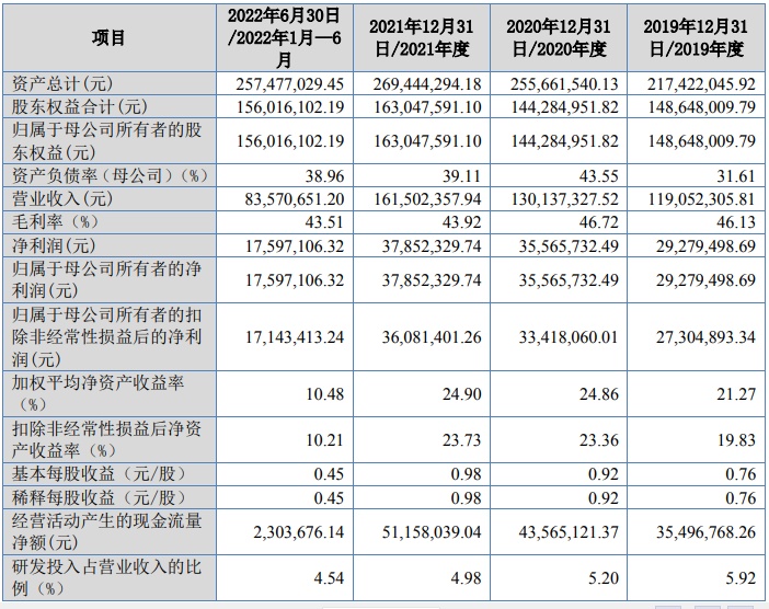 财务方面,于2019年度、2020年度、2021年度及2022年上半年,明阳科技实现营业收入分别约为1.19亿元、1.30亿元、1.62亿元、8357.07万元人民币;归母净利润分别约为2927.95万元、3556.57万元、3785.23万元及1759.71万元人民币。