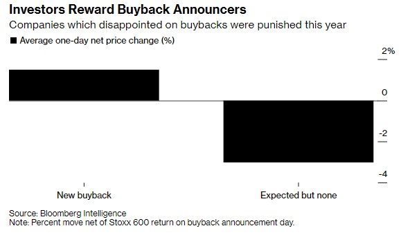 策略师Laurent Douillet和Kaidi Meng指出,斯托克600指数成分股公司中,今年宣布新的回购计划的股票单日涨幅为1.5%,而那些在过去两年有过大规模回购——但暂停或没有续期——的股票当日平均净下跌3%。