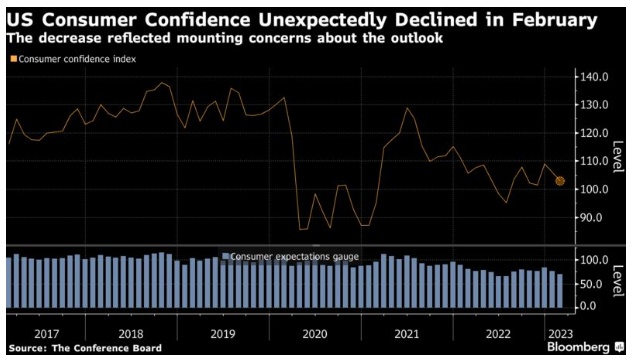 尽管劳动力市场依然强劲,美国2月份消费者信心意外下降,原因是服务业价格飙升与对衰退的担忧。智通财经获悉,根据世界大型企业联合会的数据,美国2月谘商会消费者信心指数降至102.9,前值为106,连续第二个月下滑,而分析师的预期为108.5。