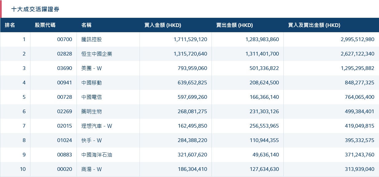 此外,恒生中国企业(02828)获净买入431万港元。而理想汽车-W(02015)、香港航天科技(01725)分别遭净卖出2.64亿、1067万港元。