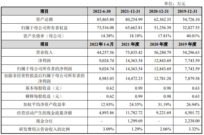 财务方面,于2019年、2020年、2021年及2022年上半年,该公司实现营业收入分别约为5.43亿元、5.63亿元、7.58亿元及4.43亿元;同期,该公司实现归属于母公司所有者的净利润分别约为7743.59万元、1.28亿元、1.44亿元及9024.74万元。