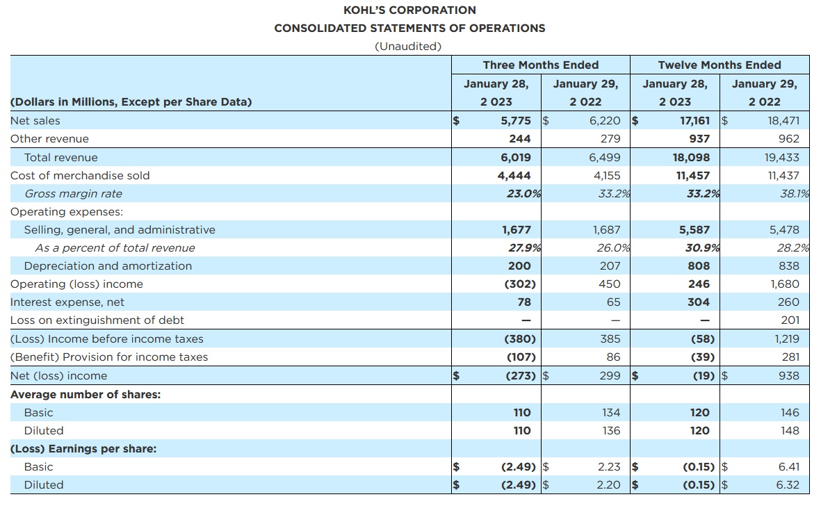 智通财经APP获悉,3月1日(周三)美股盘前,柯尔百货(KSS.US)公布了2022财年第四季度及全年财务业绩。财报显示,柯尔百货Q4营收同比下降7.4%至60.19亿美元。其中,净销售额同比下降7.2%至57.75亿美元,低于分析师预期的约60亿美元;可比销售额同比下降6.6%,逊于分析师预期的同比下降3.7%。