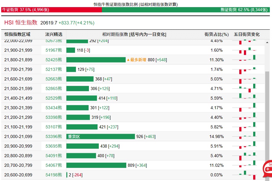 法兴恒指牛熊证街货分布图中的数据显示,熊证街货重货区在21000-21099区间,该区间最新熊证数量为926张,较上一交易日增加463张;最多新增在21800-21899区间,该区间最新熊证数量为800张,较上一交易日增加548张。