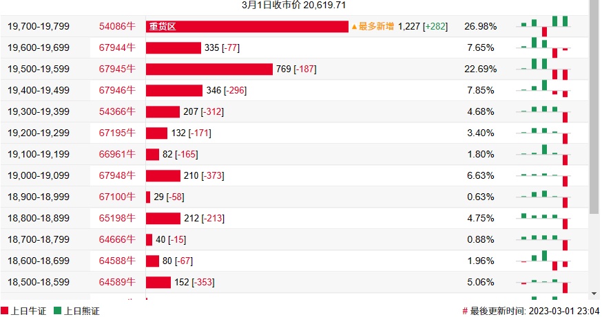 牛证街货重货区在19700-19799区间,该区间最新牛证数量为1227张,较上一交易日增加282张;最多新增在同一区间。
