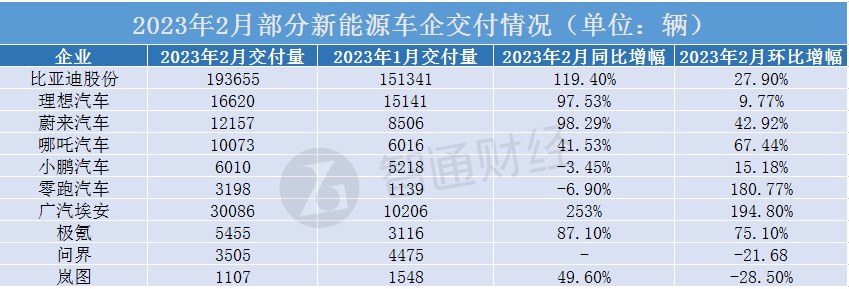 智通财经APP获悉,3月1日,多家新能源汽车企业公布了2023年2月的新车交付情况。比亚迪股份(01211)凭借193655辆的销量,领跑新能源汽车销量榜;造车新势力方面,理想汽车(02015)依旧保持强劲势头,其仍位列当月造车新势力新车交付榜第一位,2月交付量为16620辆,同比大增97.5%,蔚来汽车(09866)2月交付量为12157辆,交付回到万辆上方。
