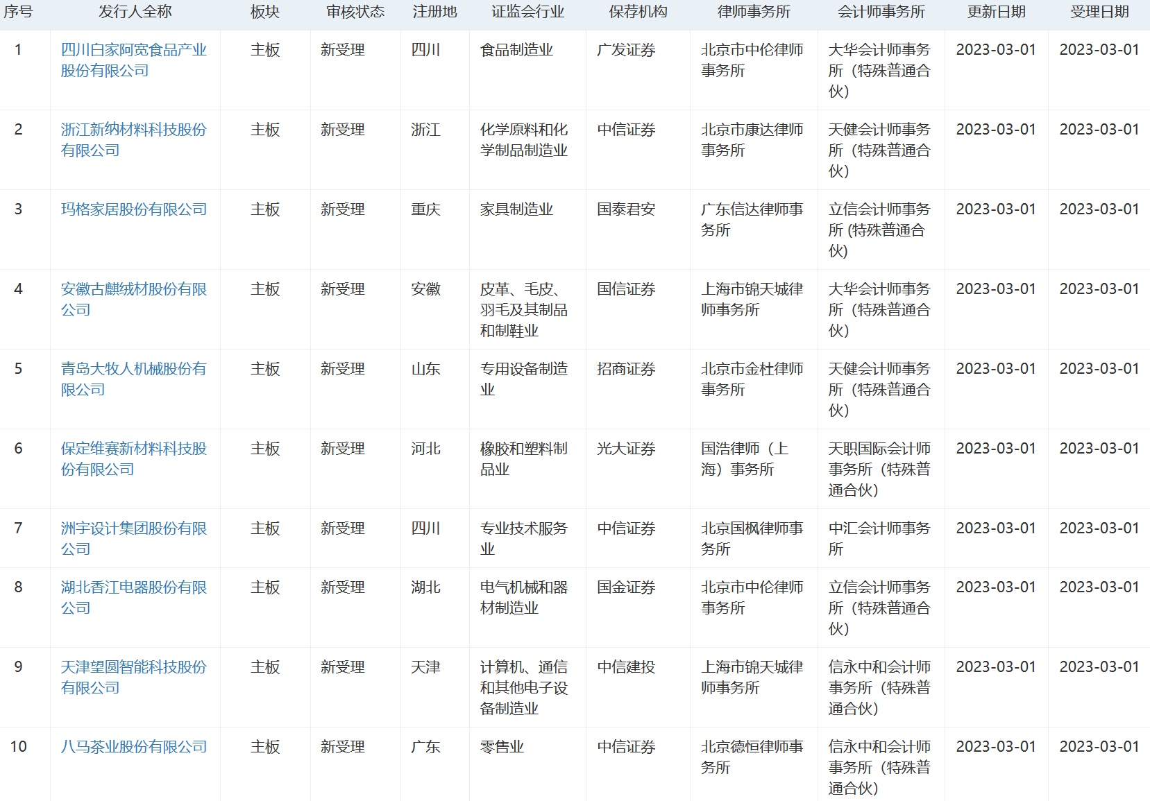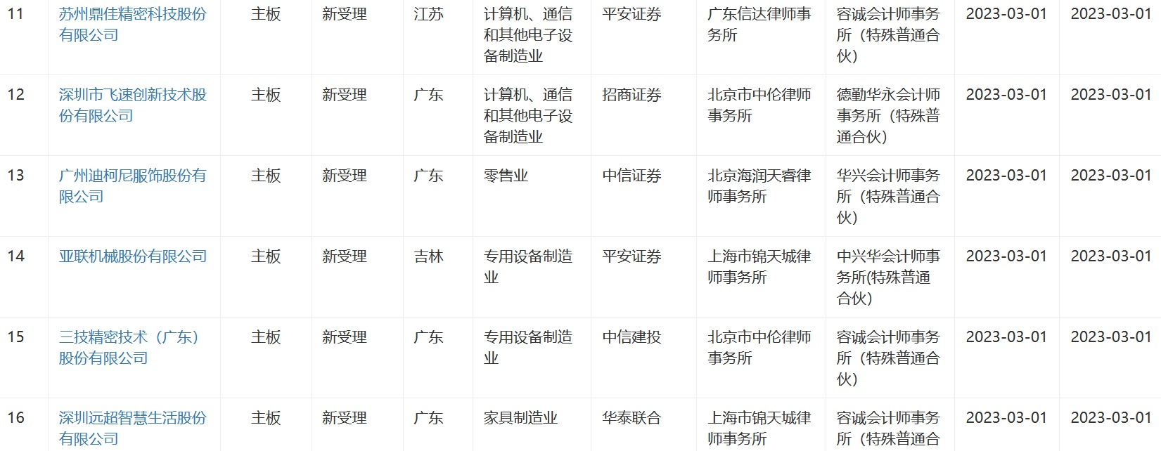 智通财经APP获悉,3月1日,阿宽食品、新纳科技、玛格家居、古麒绒材、大牧人、维赛新材、洲宇设计、香江电器、望圆科技、八马茶业、鼎佳精密、飞速创新、迪柯尼、亚联机械、三技技术、远超智慧等16家公司申请IPO获深交所受理。