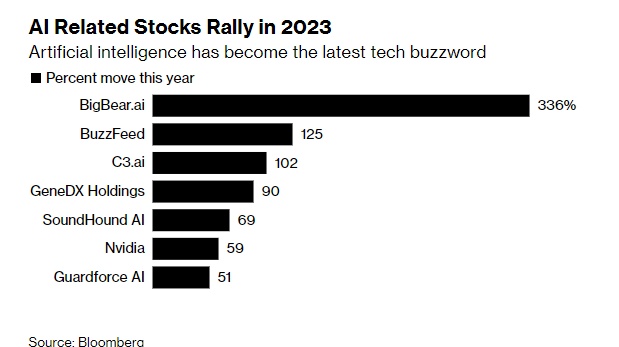 这也不足为其。渴望人工智能的投资者推动AI芯片领军者英伟达(NVDA.US)一跃成为今年大盘股中表现最好的股票,该公司为复杂的人工智能计算任务制造所需的最底层技术——GPU芯片。名称中带有AI的一些相对默默无闻的公司也迅速崛起,比如BigBear. ai Holdings(BBAI.US)年内涨幅超过280%,而 C3.ai(AI.US) 和 BuzzFeed(BZFD.US)涨幅均超过一倍。Guardforce AI(gfai.us)股价上涨约50%。