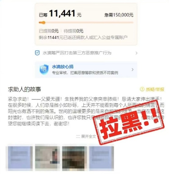 二是家庭经济状况不符合发起条件。例如,患者陈某患肺癌后,家属申请发起目标金额为15万元的筹款申请。平台在材料审核过程中发现,陈某有多个子女,申请发起案例时隐瞒其子女的高价值房产,同时陈某家庭正经营车辆生意,收入颇丰。因此,平台判断其家庭有足够经济能力来支付患者的治疗花费,不符合发起条件,平台对筹款项目进行拦截,并将发起人列入平台黑名单,已筹款项全部退还赠与人。