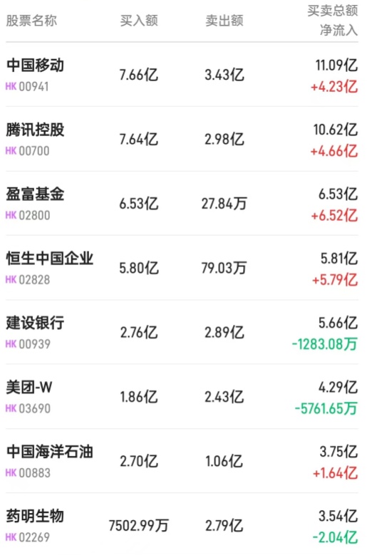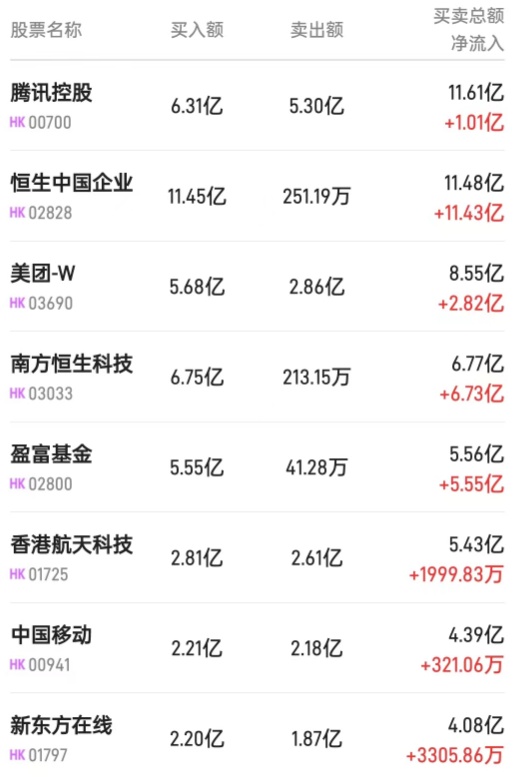 北水净买入最多的个股是恒生中国企业(02828)、盈富基金(02800)、南方恒生科技(03033)。北水净卖出最多的个股是建设银行(00939)。