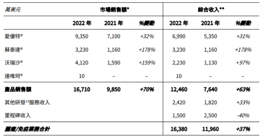 智通财经APP了解到,2022年和黄医药总营收达到4.26亿美元,创新药板块中,公司肿瘤/免疫综合业务收入达1.64亿美元,同比增长37%。不考虑合作方分成情况下,公司三款已商业化的肿瘤创新药的实际销售额则达到1.67亿美元。其中,苏泰达®自2022年1月起获纳入国家医保药品目录后,收入增长178%至3230万美元。
