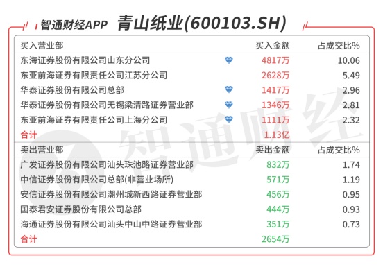 青山纸业(600103.SH):多主力现身龙虎榜,量化基金买入1417万元,买一是知名游资的席位买入4817万元,买四是知名游资的席位买入1346万元,当日净买入8664万元,该股今日放巨量涨停,上涨需持续放量。